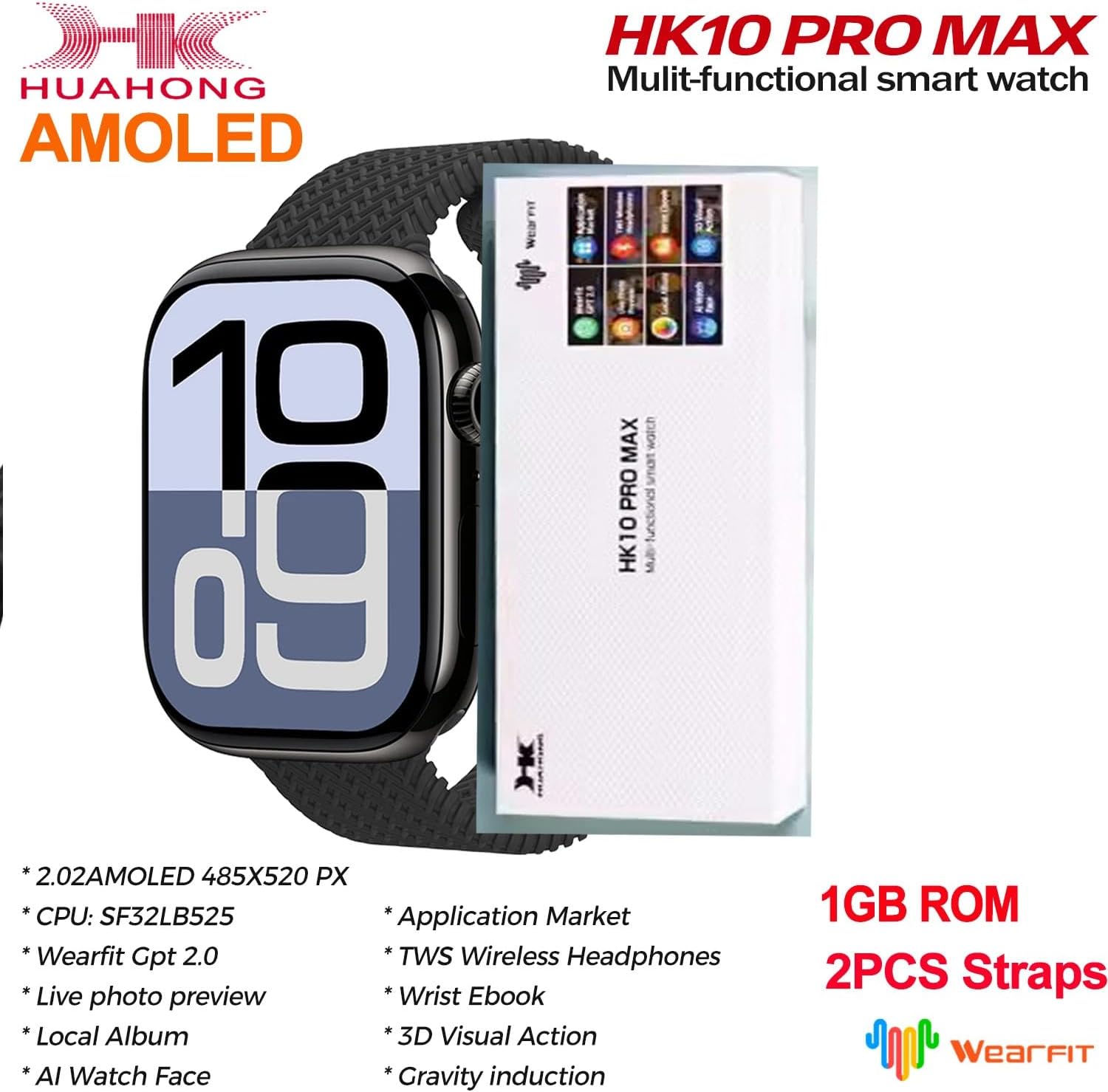 New style series10 watch body, New Gravity-sensing dial, Newest Ui design, New 3D menu style, Always-on display dials, Support 12/24 hours time format(setting in Wearfit Pro), 1GB ROM, Local music, Connect to TWS earphone, Photo Album, Sound recording, Calendar, Ai watch face, Gesture touch control, ChatGPT, Real Compass, Heart rate, Blood pressure, Blood oxygen, Sports, Sleep monitoring, Pressure, Activity record, Bluetooth calls, Message notification, Voice assistant, Weather, Alarm clock, Stop watch, Breathing training, Timer, Find phone, Alipay, respiratory rate, short video control, Camera control, Notification setting, Beside clock mode, Active wrist wake-up, Do not disturb mode, screen off time ,NFC door access, screen off watch face, Brightness adjustment ...